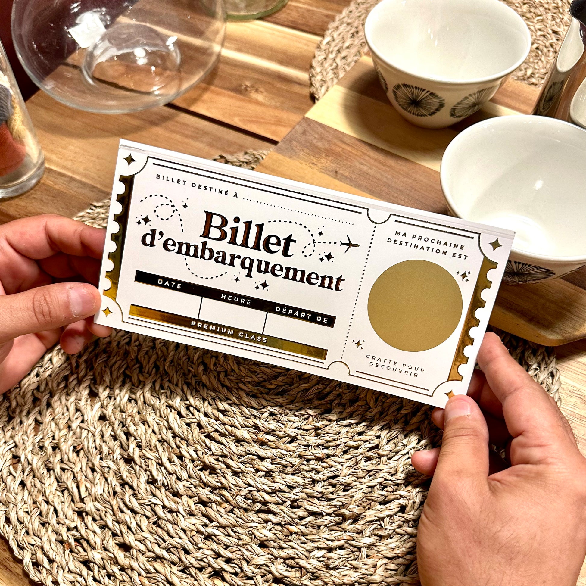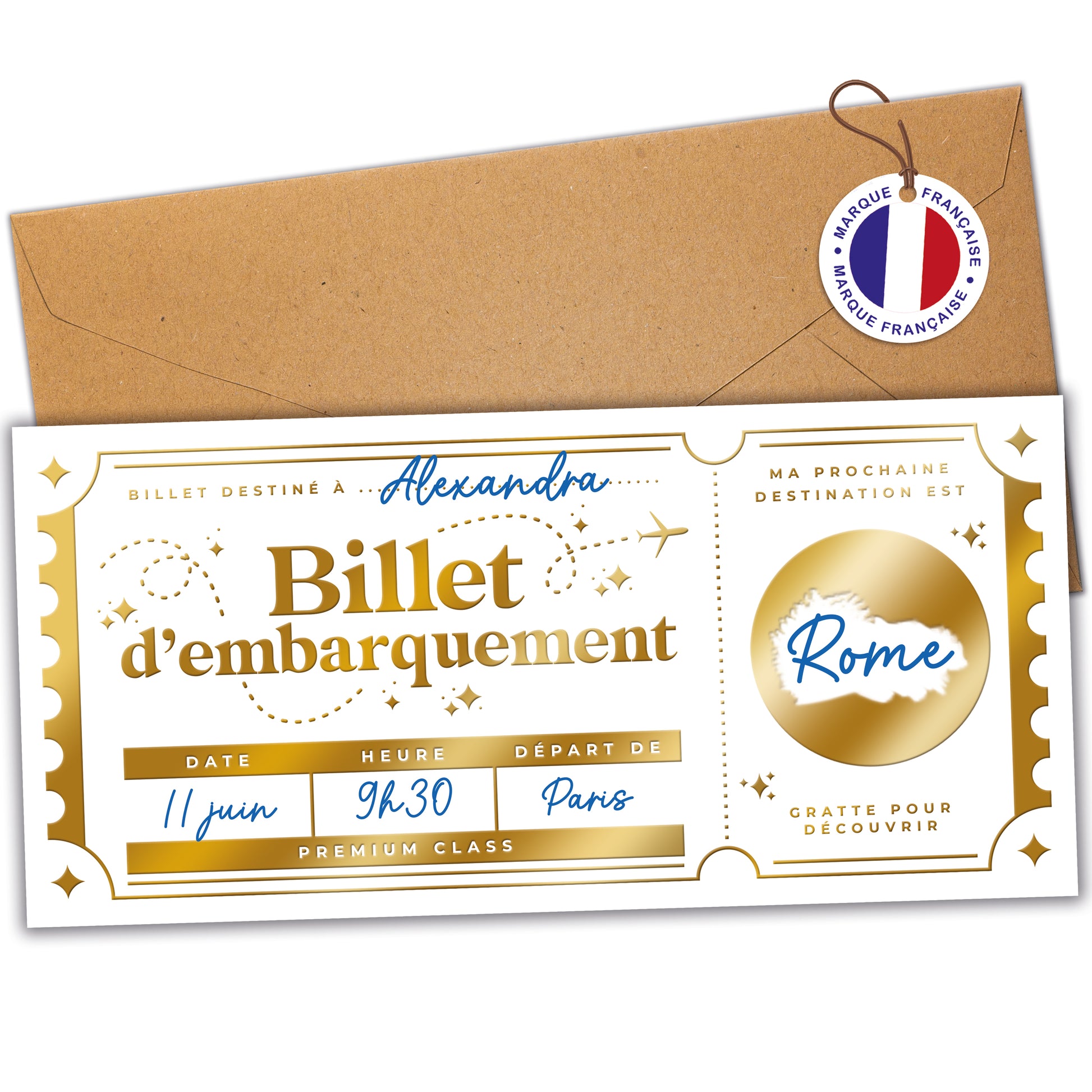 Offrez une annonce de voyage mémorable avec ce billet d’embarquement à gratter au design doré luxueux. Grâce à sa dorure à chaud et son espace personnalisable, il transforme la révélation d’une destination en un moment de surprise et d’émotion. Un cadeau raffiné qui se garde comme souvenir précieux.