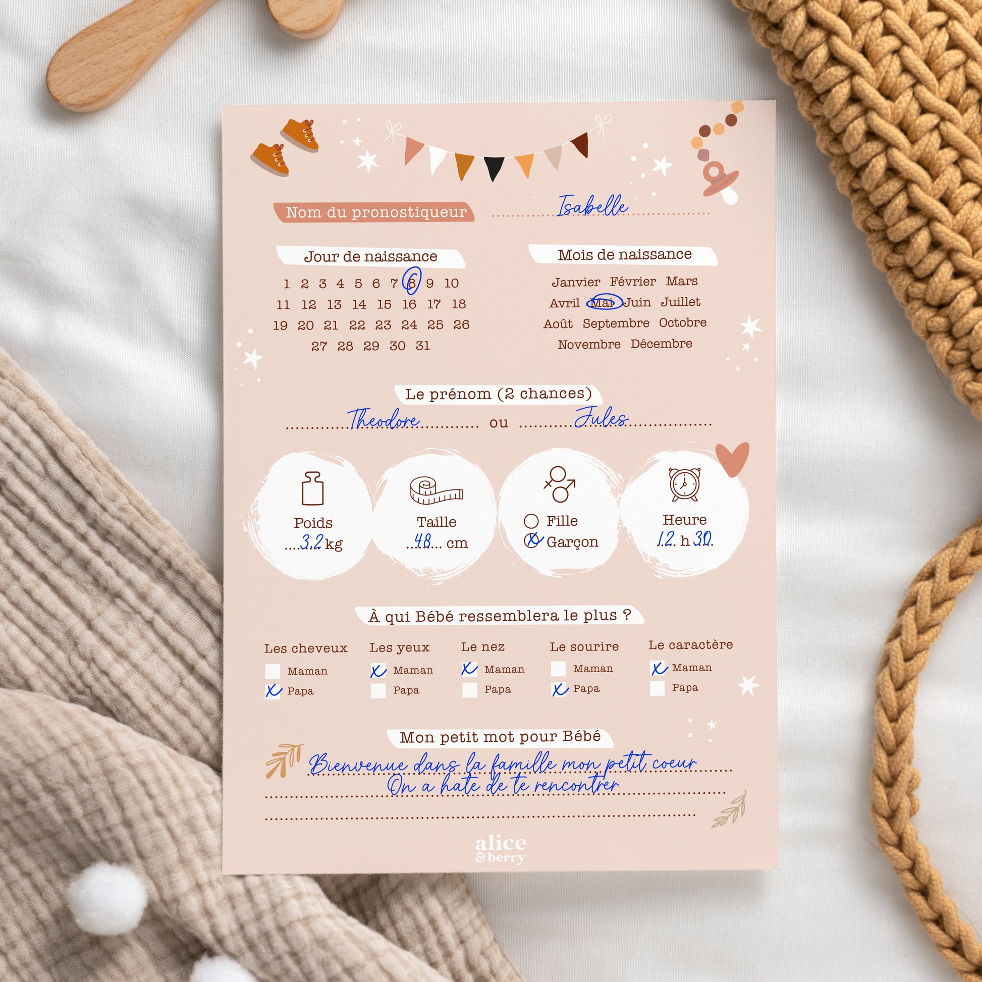 Plus qu’une simple animation, nos cartes pronostics transforment votre fête en un moment inoubliable. Qu’il s’agisse du modèle Olive, Poudré ou Terracotta, chaque carte capture les prédictions et les éclats de rire de vos proches. Ces précieux souvenirs deviendront un joli trésor à feuilleter avec votre enfant pour revivre l’émotion de cette journée.