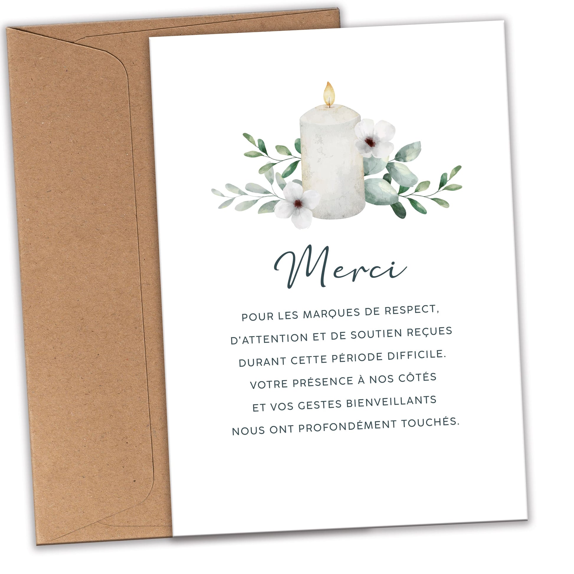 En période de deuil, exprimer sa gratitude et trouver les bons mots peut être difficile. Nos cartes de remerciement décès sont conçues pour vous soulager de cette tâche avec simplicité. Avec leur design sobre et leur texte pré-rédigé, elles vous permettent d'envoyer vos remerciements plus facilement. En plus, chaque carte est fournie avec son enveloppe. C'est le moyen le plus simple et le plus respectueux de dire merci pour le soutien de vos proches.