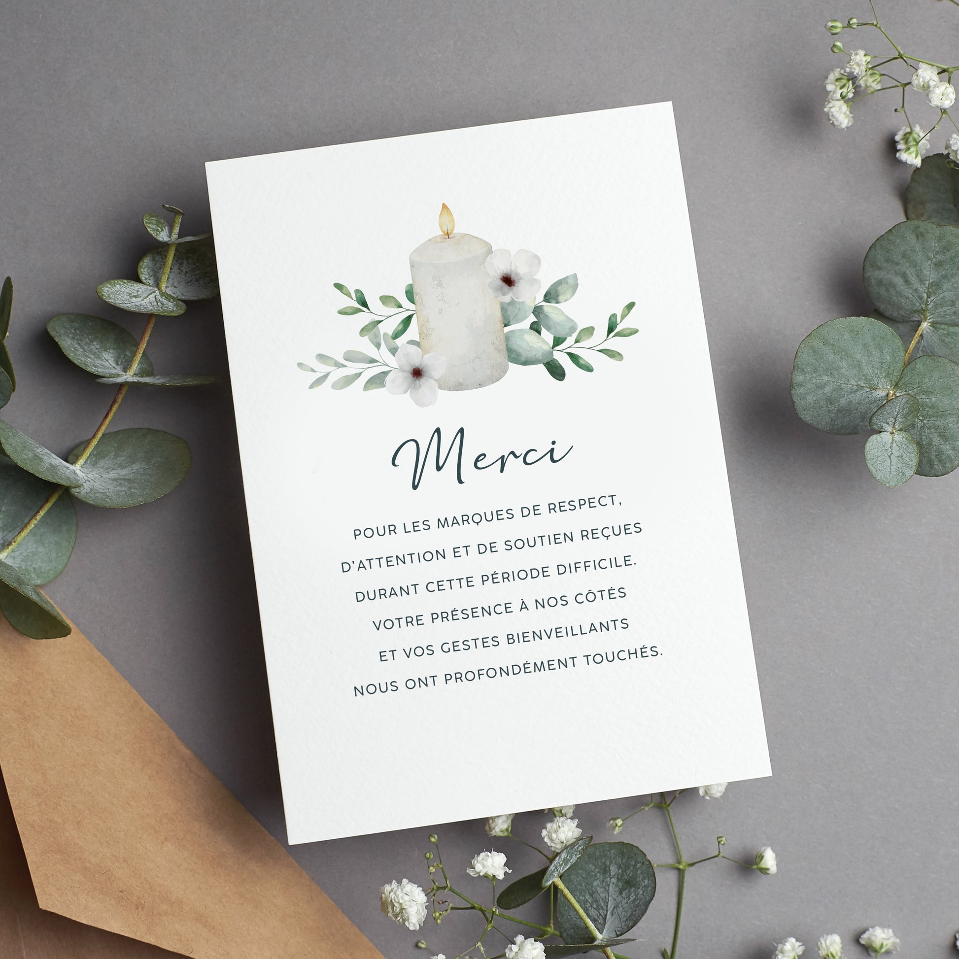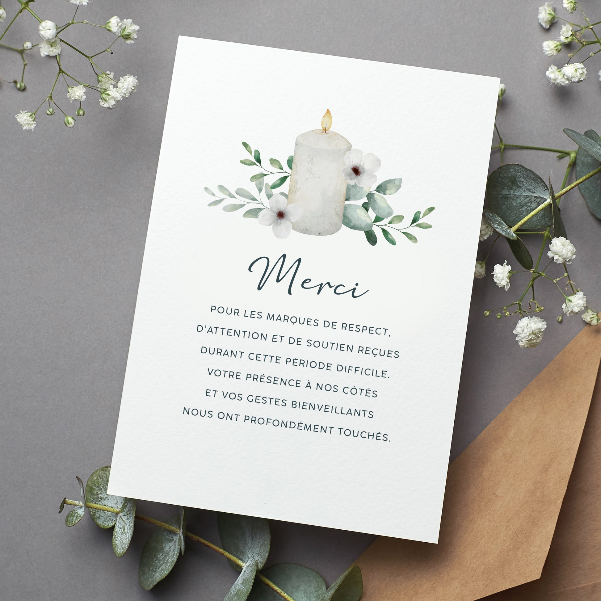 Un hommage sobre et élégant. Cette carte de remerciement deuil, au design épuré d'une bougie, est conçue pour exprimer avec sincérité votre reconnaissance à la famille et aux proches. Imprimée sur un papier épais 400g et fabriquée en France, elle est le support parfait pour vos condoléances. Un texte déjà rédigé est inclus pour vous soutenir. Livrée avec son enveloppe incluse, cette carte facilite l'envoi de vos remerciements après les obsèques.