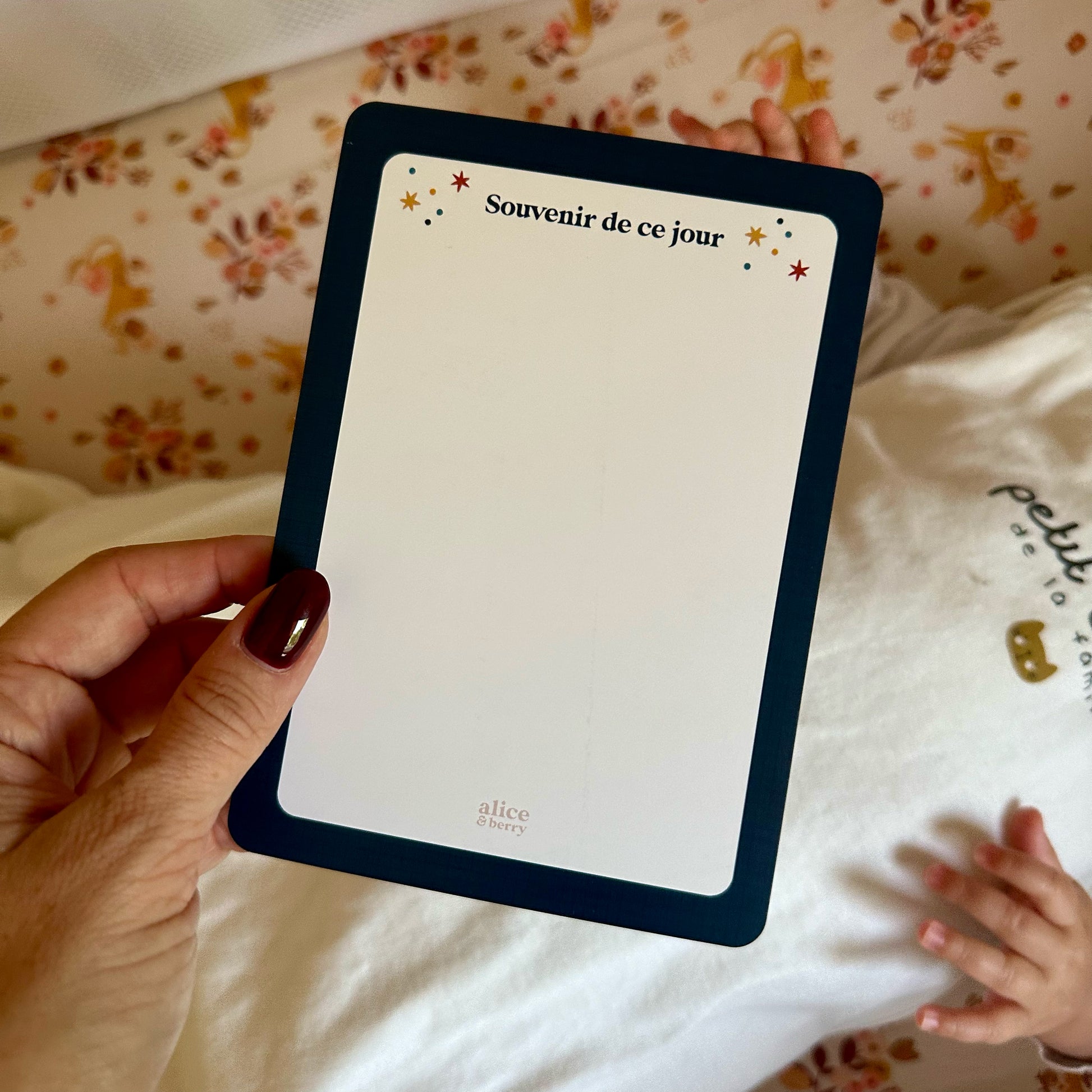 Capturez les moments les plus précieux de la première année de votre bébé avec nos cartes moiniversaire et étapes ! Que vous choisissiez le pack de 16 cartes pour immortaliser chaque mois, le pack de 24 pour célébrer toutes ses “premières fois”, ou notre coffret complet de 40 cartes, vous aurez tout pour créer un album souvenir unique. Chaque carte, au design mixte et tendance (jaune, terracotta, bleu), est imprimée sur papier épais avec un espace pour noter la date et vos petits mots. Un cadeau de naissance ou de baby shower parfait pour offrir aux jeunes parents un trésor de souvenirs à revivre dans quelques années.