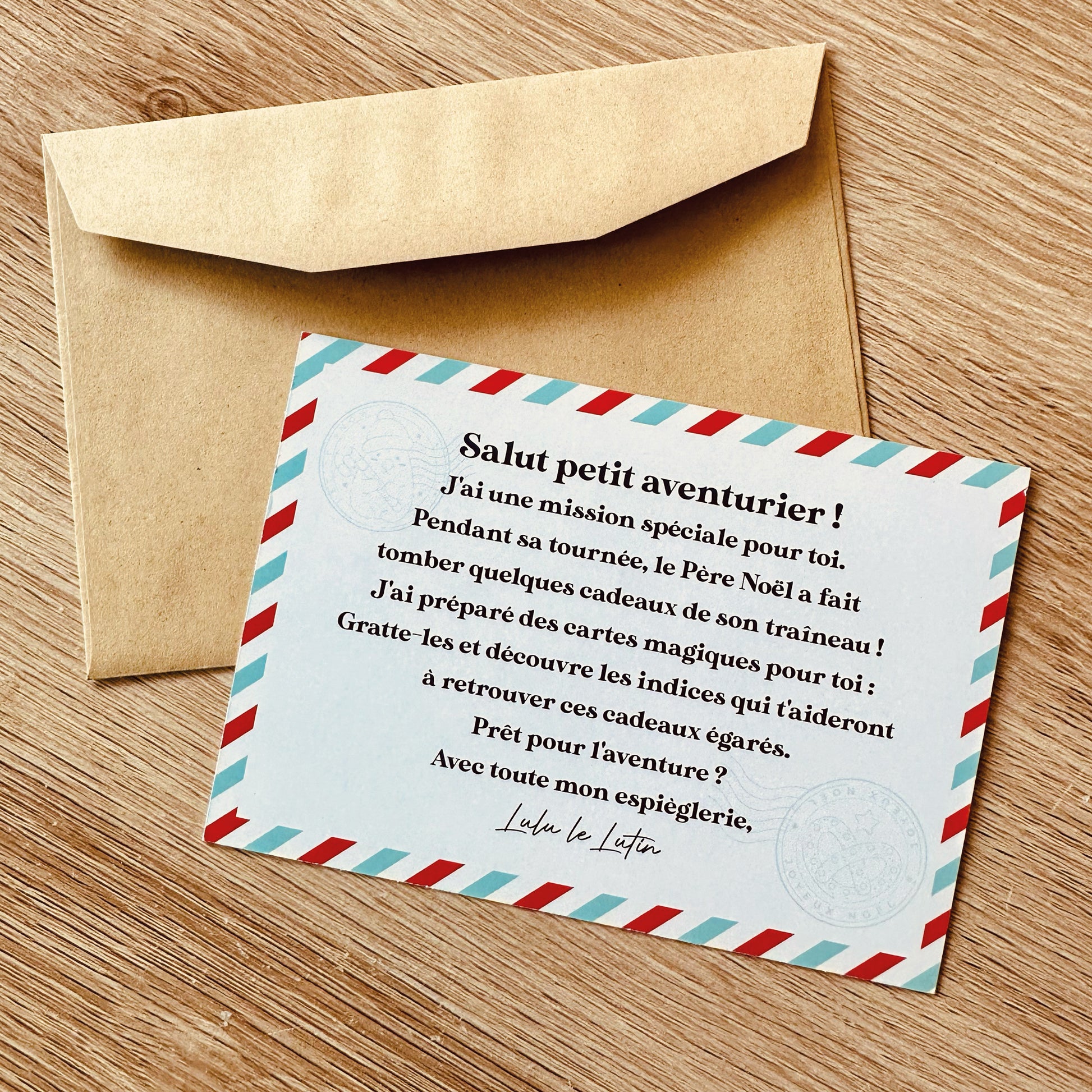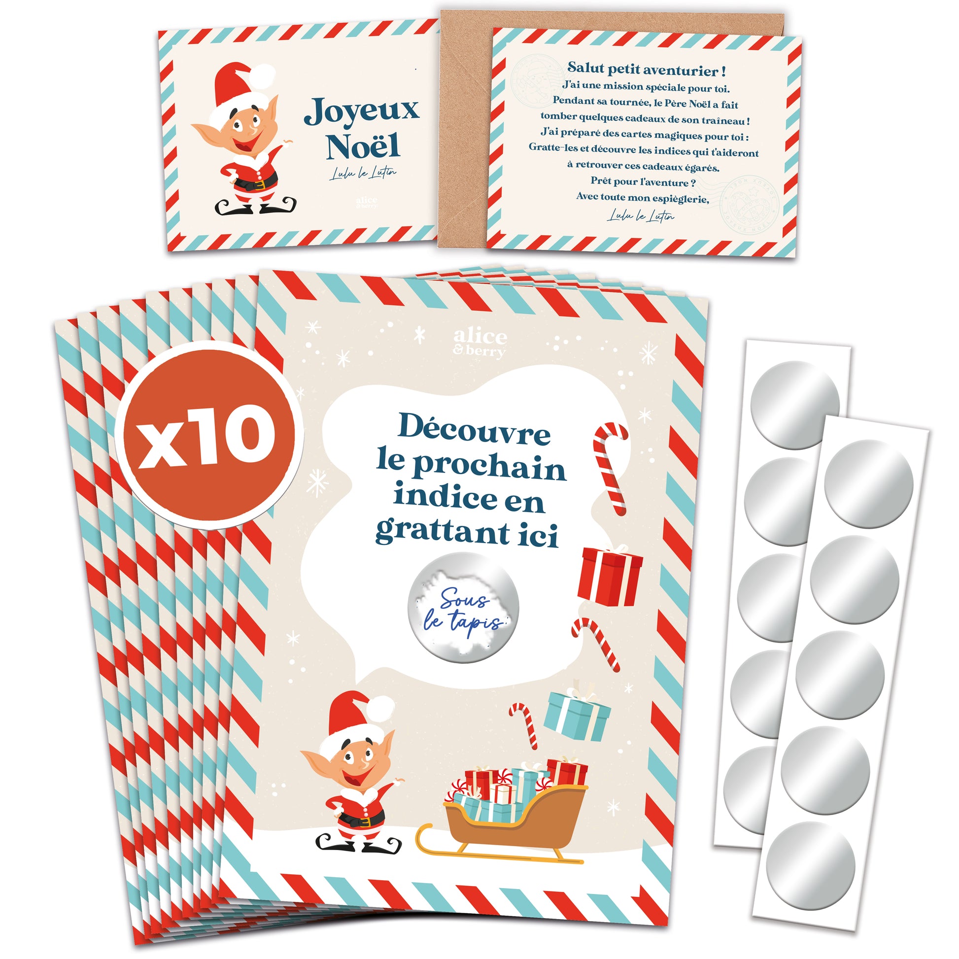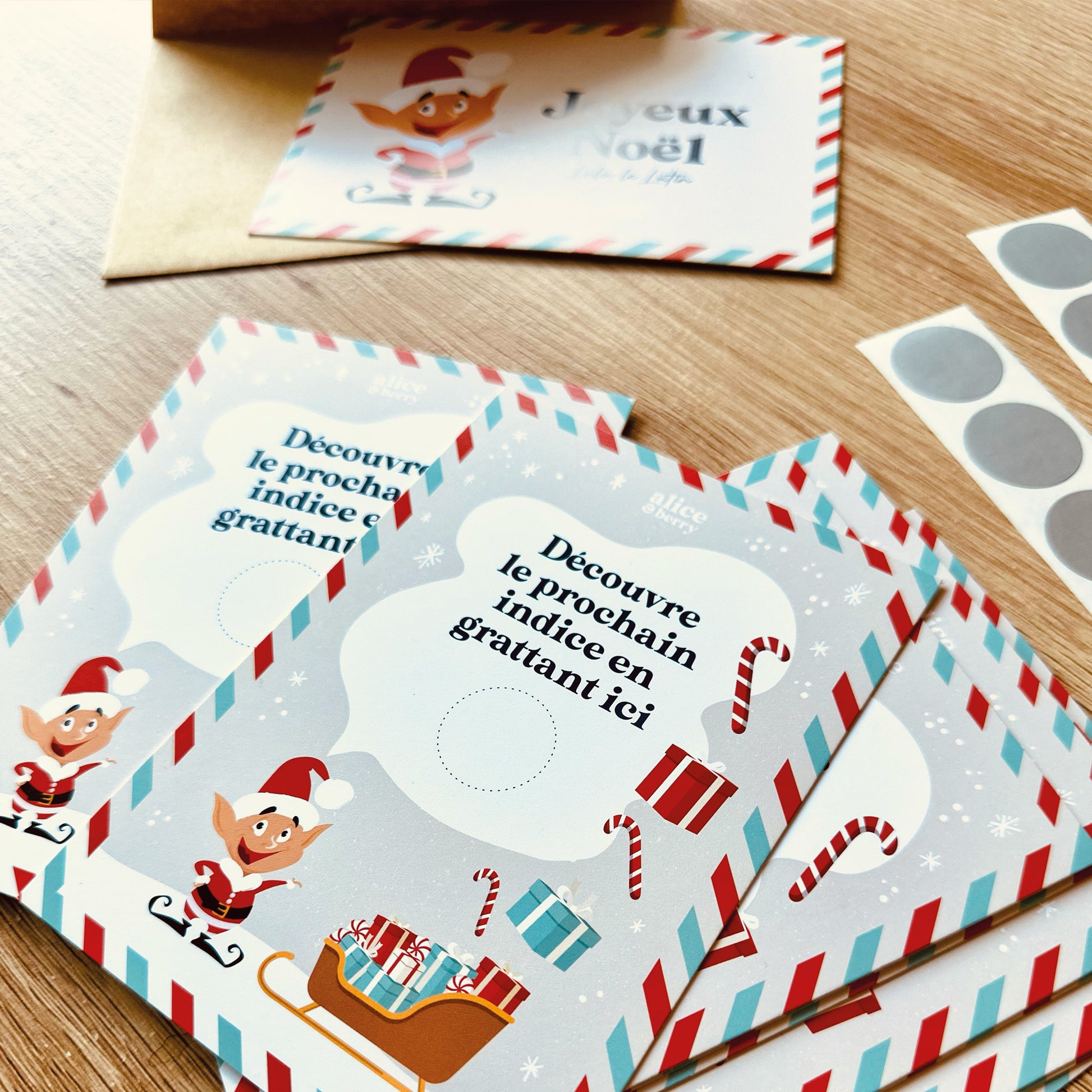 Créez une chasse aux trésors de Noël sur mesure pour les enfants ! Ce jeu à gratter est l'activité idéale pour une fête ou un moment convivial à la maison. Le principe est simple : vous préparez le parcours en cachant les 10 cartes remplies d'indices pour que les enfants avancent de cachette en cachette jusqu'à trouver leur cadeau. Totalement personnalisable, ce jeu s'adapte à tous les espaces, en intérieur ou en extérieur, et promet de la magie pour les petits comme pour les grands.