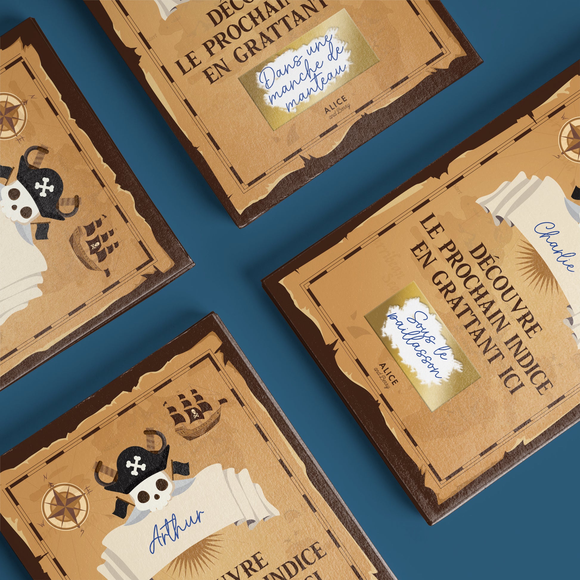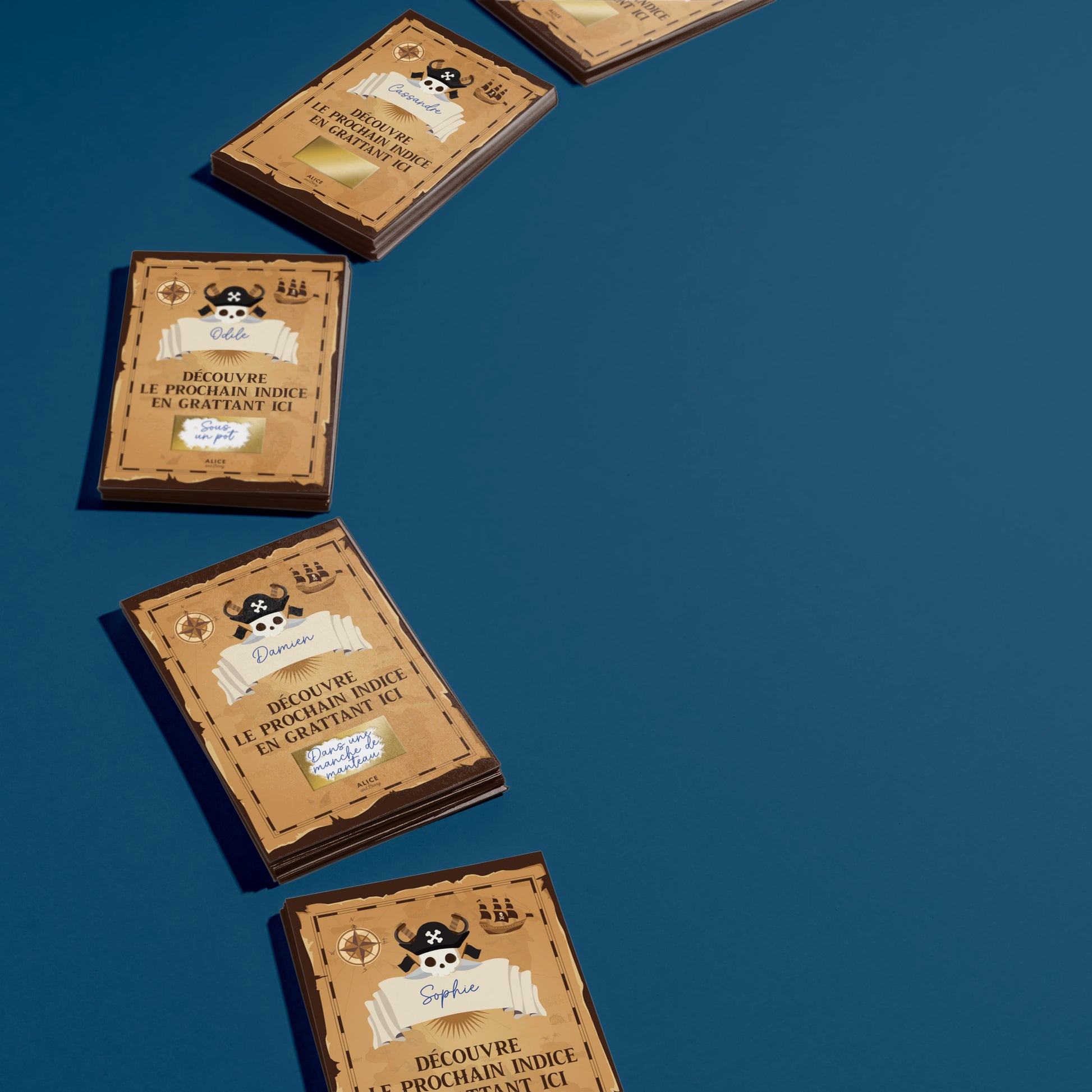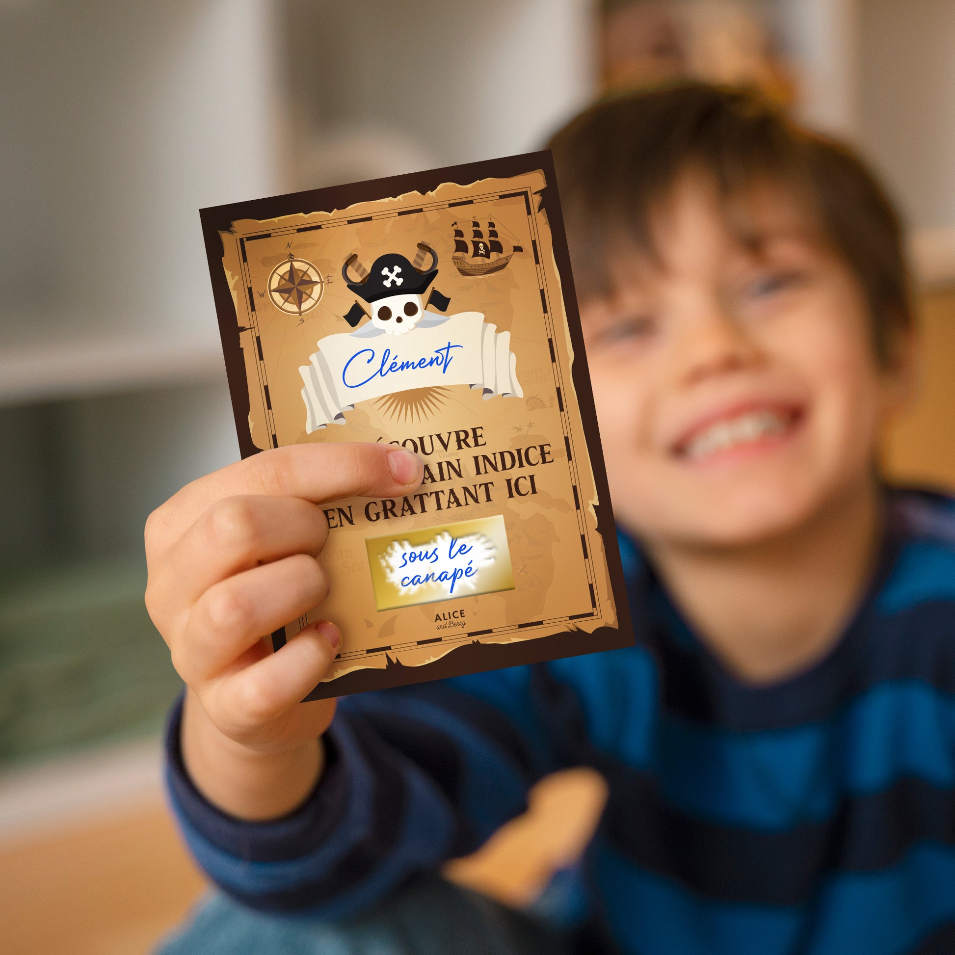 Préparez une aventure de pirates pour votre enfant ! Notre chasse au trésor à gratter est une activité créative et personnalisable, parfaite pour un anniversaire ou un goûter. Le jeu est simple : vous écrivez les indices sur 8 cartes, les cachez et laissez les petits pirates résoudre les énigmes jusqu'à trouver le trésor final. Facile à organiser, cette chasse aux trésors convient en intérieur ou en extérieur.