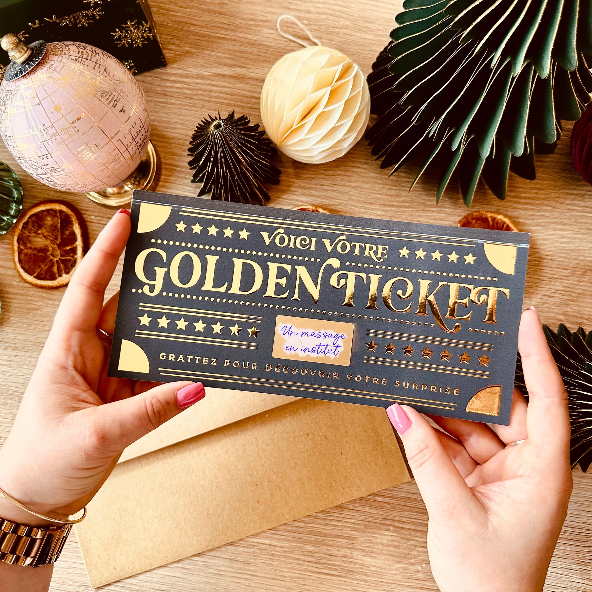 Rien ne vaut un Golden Ticket pour une surprise grandiose ! Cette carte cadeau à gratter est idéale pour offrir une expérience (séjour, concert...) de manière élégante et qualitative. L'effet de suspense est total, maintenu par la pastille à gratter. Imprimé sur un papier épais avec une dorure à chaud, ce ticket personnalisable est un cadeau qui se conserve, prêt à être offert avec son enveloppe. Un souvenir précieux à conserver après l’événement.