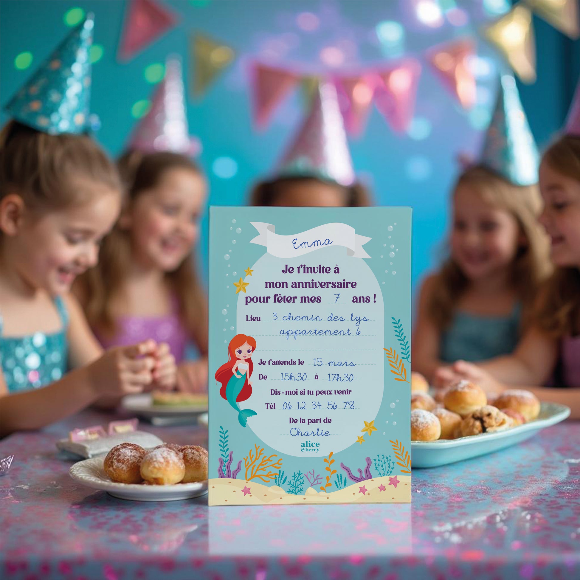 Faites un splash ! Nos invitations anniversaire sirène sont le moyen parfait d'inviter à une fête d'enfant au thème de l'océan. Leur design magique transporte les invités dans un monde féérique. L'organisation est facile avec les champs pré-remplis et les enveloppes incluses, le tout sur un papier de qualité.