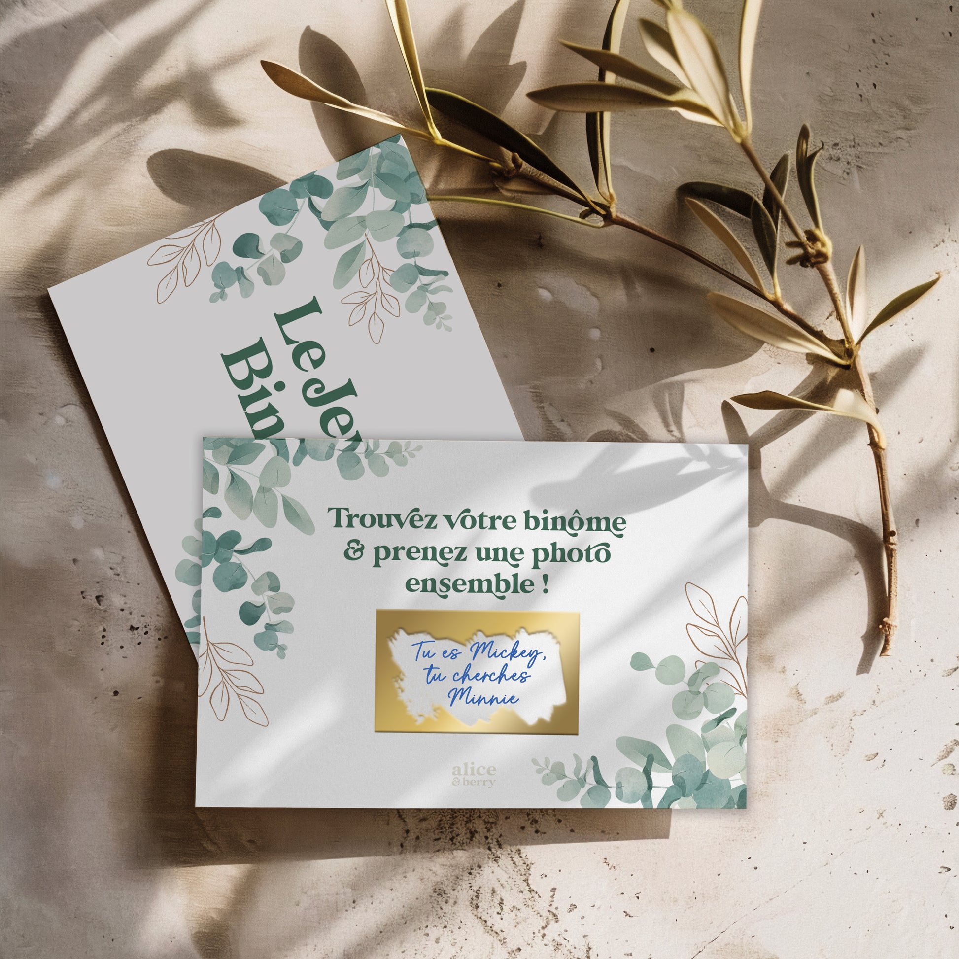 Jeu binômes mariage eucalyptus – 50 cartes à gratter photobooth