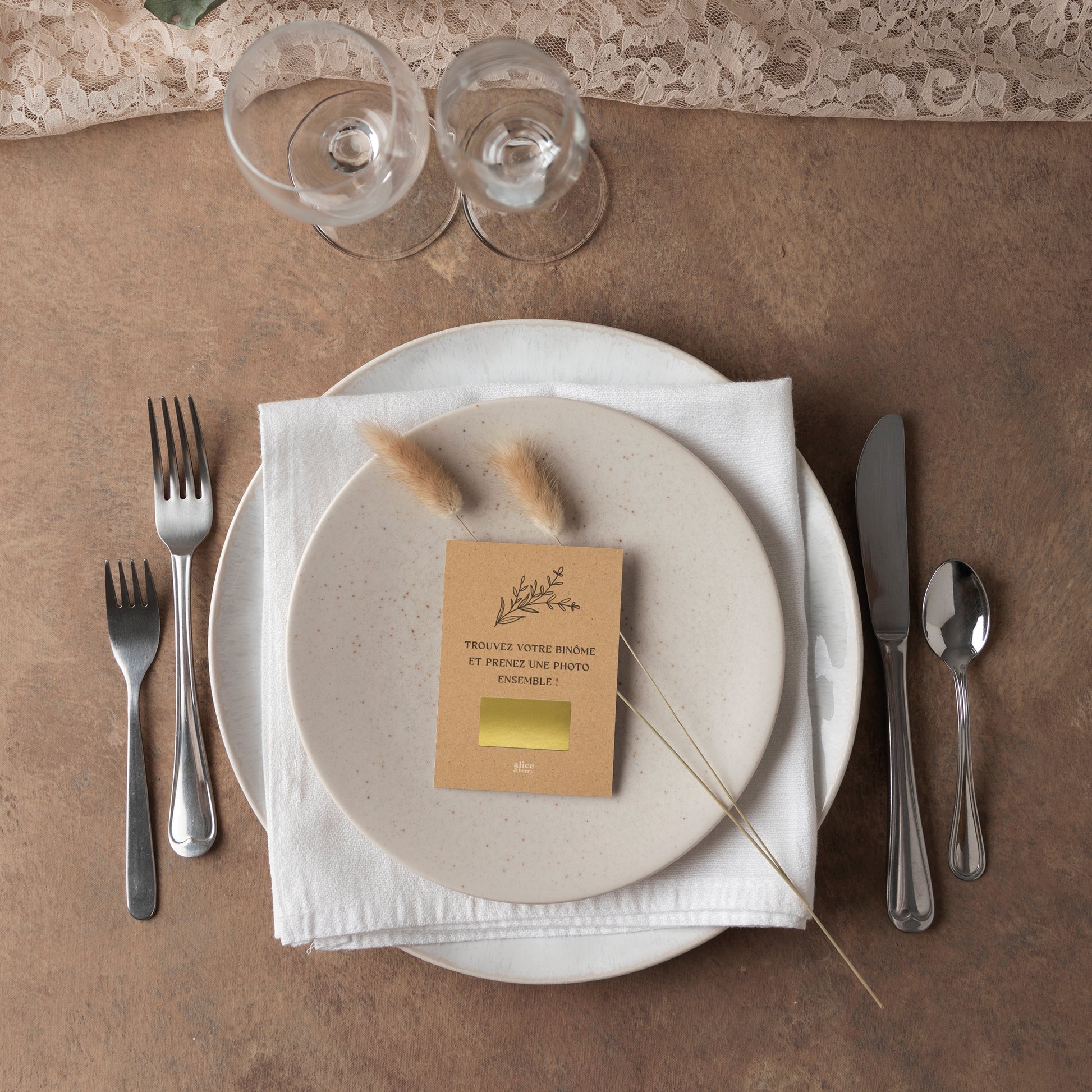 Animez votre mariage de façon originale ✨ avec notre jeu des binômes à gratter au design kraft rustique. Chaque invité gratte sa carte pour découvrir son partenaire mystère, puis se retrouve avec lui pour une photo complice au photobooth. Résultat : fous rires, ambiance détendue et souvenirs uniques garantis !